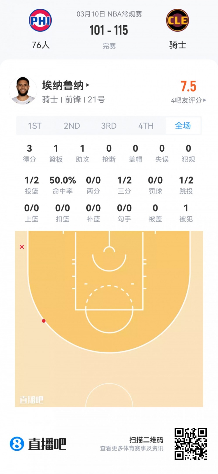 骑士落选秀特里斯坦·埃纳鲁纳 登场3.8分钟